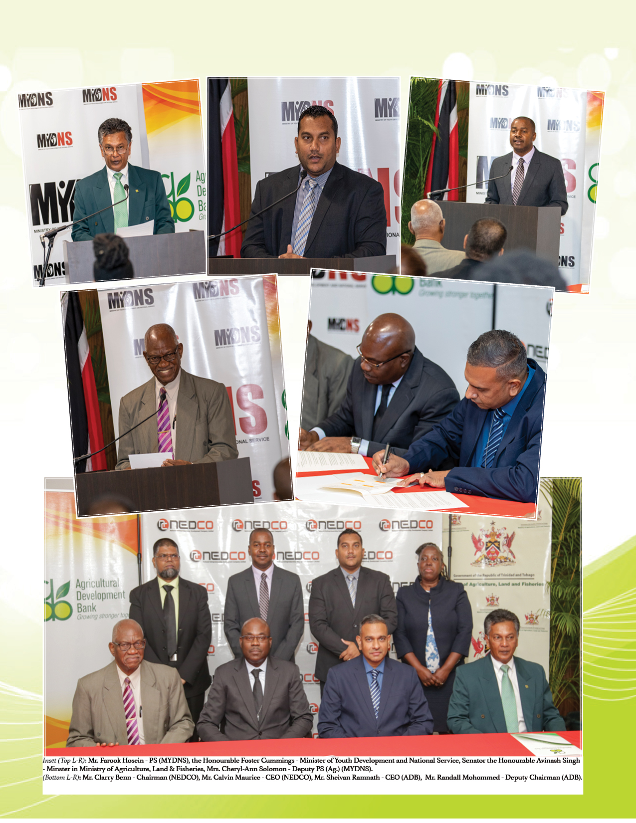 The ADB and NEDCO through this MOU will support the development of local small and micro enterprises within the Agriculture Sector. The initiative will support business incubation through the development of entrepreneurial skills with the intention of making participants more suitable for credit within the agri-business demographic. It acknowledges that the sector has its inherent risks and other vulnerabilities that impact business. This collaborative effort will therefore impact the business management learning curve to manage the high business risks associated with this sector.