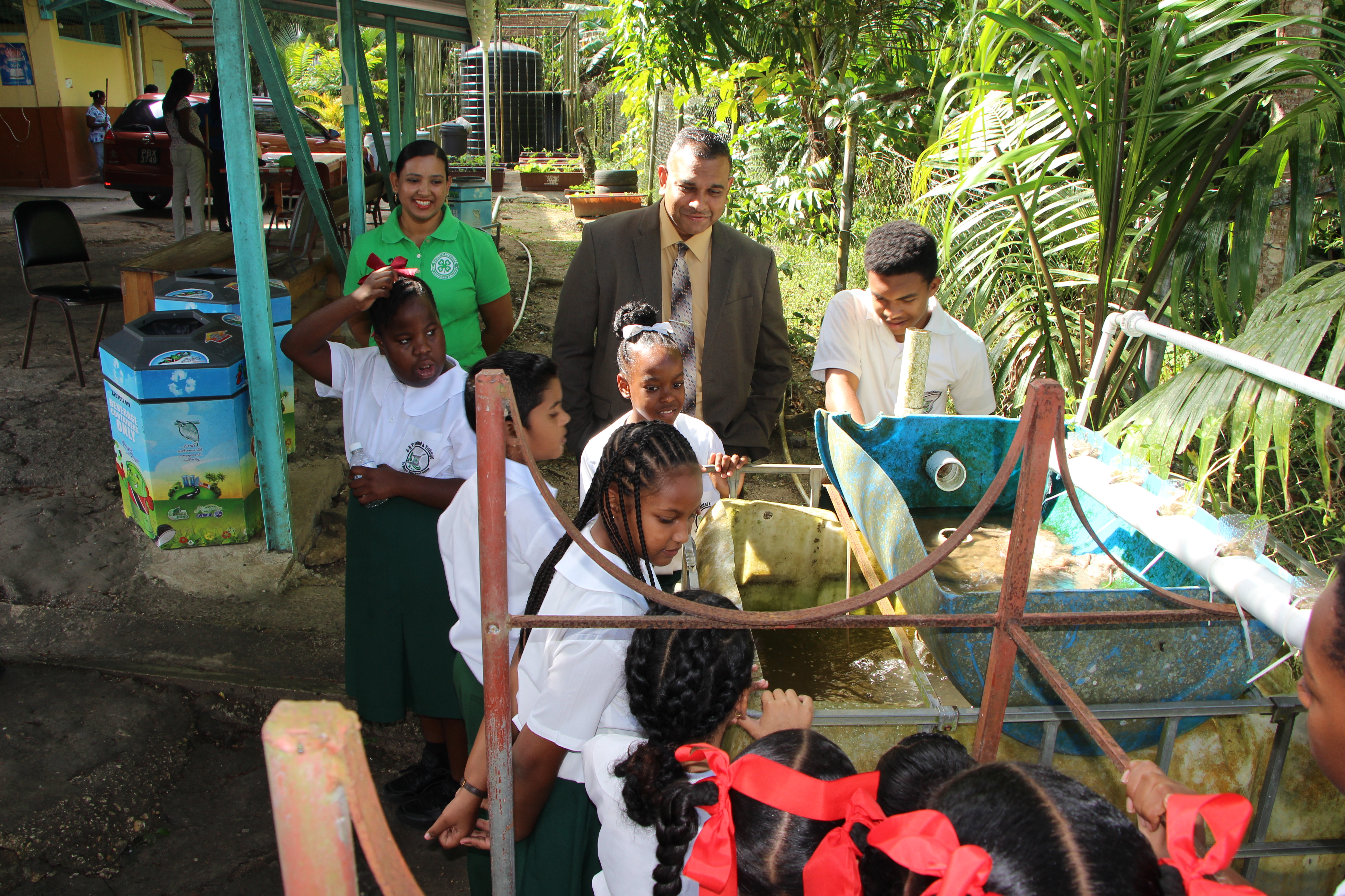 Sister’s Road AC is involved with the 4H Agriculture Programme which forms part of the Ministry of Education schools’ curriculum. Its population of 75 students, headed by Principal, Mr. Clint Lee and a staff of 7 teachers have embarked on several small agri projects which include aquaculture rearing of tilapia; grow boxes which are currently planted with peppers, lettuce, celery and chive; two vines of barbadine grown in tyres and small crops of tomatoes and seasonings planted on a cleared area to the back of the school’s building.
